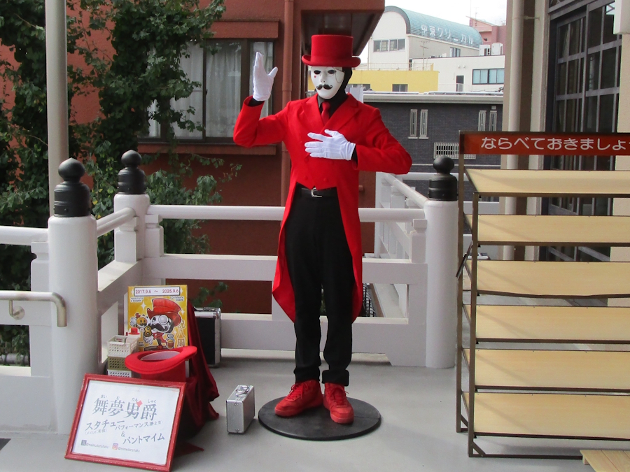 本堂入り口には、スタチュー・パントマイマーの舞夢男爵(マイムダンシャク)が塑像のように動かないで迎えてくれる。
