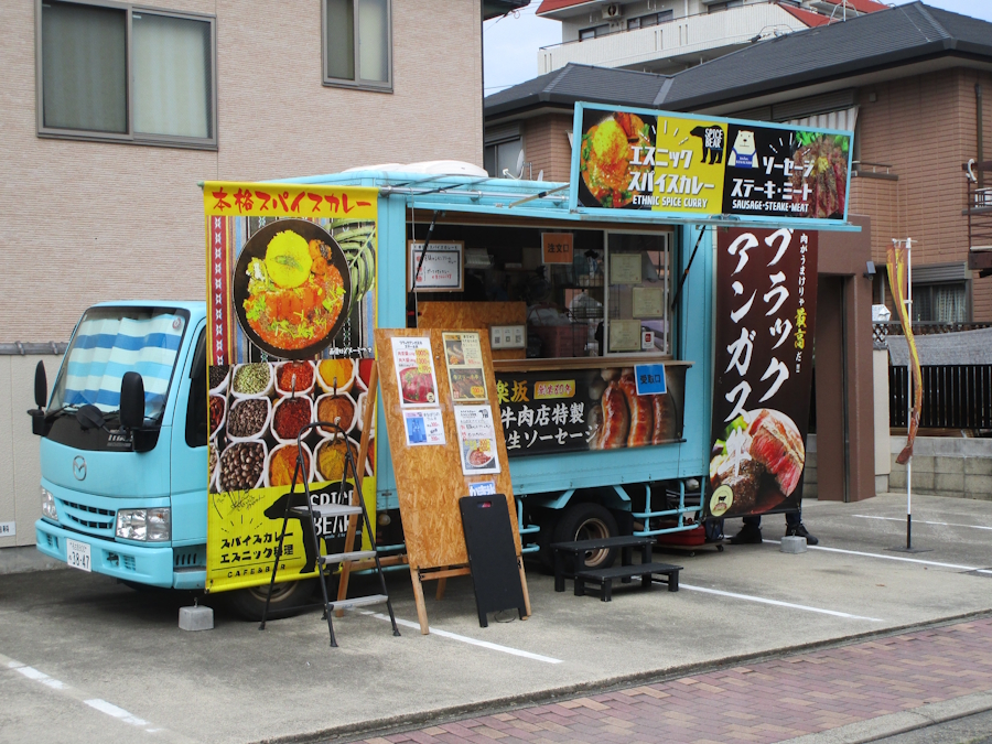 キッチンカーも。お昼にはスパイシーカレーを食べた。